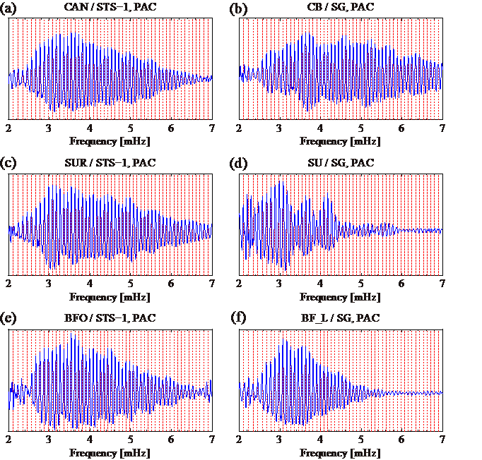 图1 不同台站超导重力仪与地震仪同址观测到的地球长周期面波信号(SG表示超导重力仪,STS-1表示地震仪;红线表示未扣除地震影响的结果,蓝线表示扣除地震影响后的结果;PAC表示相位自相关方法,CAC表示传统自相关方法;CAN和CB、SUR和SU、BFO和BF_L表示各同址观测台站)