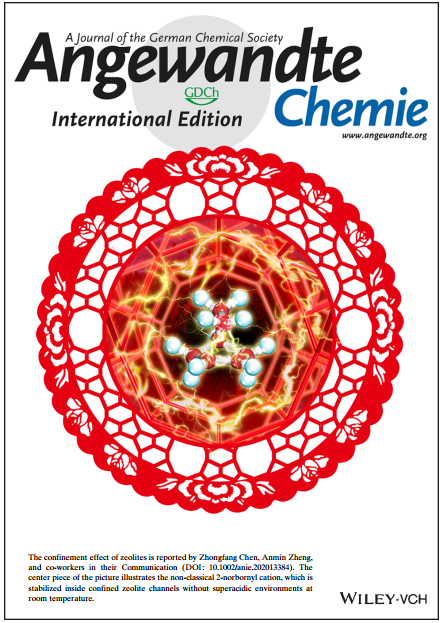 碳正离子作为重要的反应中间体,在催化反应中起到了重要的作用。其中,降冰片基碳正离子作为最著名的碳正离子,其存在形式(经典和非经典)的争议存在了近百年。直到2013年,Scholz等人(Science 2013, 341, 62-64.)利用超强酸环境下在超低温40K下利用单晶X射线衍射观测到非经典碳正离子的晶体结构,才结束了这一争议。然而,超低温的极端条件使得碳正离子难以得到更深入的研究。因此,在室温下增强降冰片基碳正离子的稳定性并进一步观测到其结构仍然是非常大的挑战。分子筛是常用的固体酸结构催化材料,广泛地应用在甲醇制烯烃和二甲醚羰基化反应中,其特有的孔道限域结构可以稳定住多甲基苯碳和环戊二烯正离子。中国科研实验室精密测量科学与技术创新研究院研究员郑安民科研团队和美国波多黎各大学的陈中方教授合作,利用从头算分子动力学和固体核磁实验相结合的方法, 原位动态地跟踪了室温下分子筛限域环境中降冰片基碳正离子的存在形式。该工作作为热点文章和封面文章(back cover)发表在学术期刊Angewandte Chemie International Edition上。