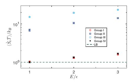 虚线为不确定性关系的下限,所有测量的四个通道的数据点(以四种颜色标记)都在虚线之上,表明耗散-时间不确定性关系创建