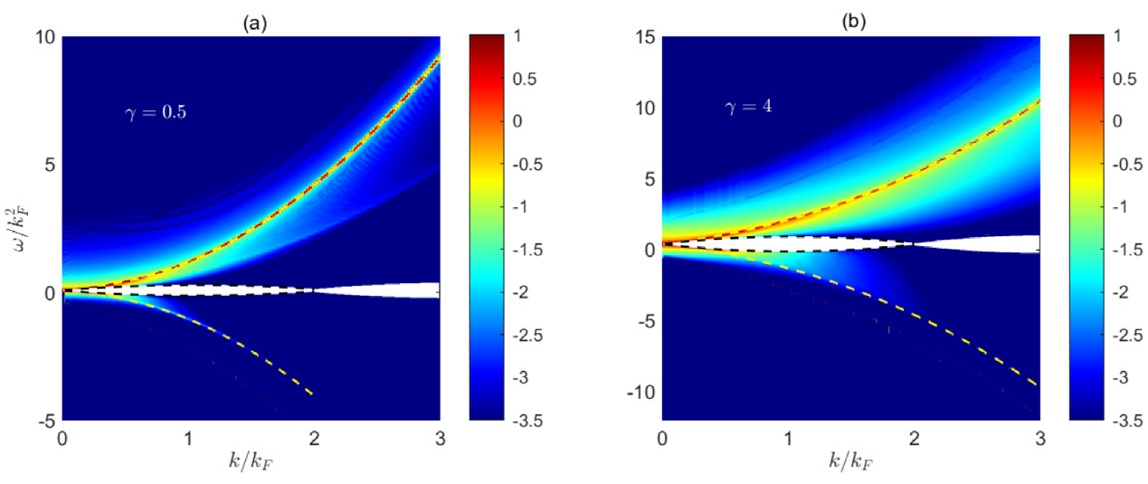 左图,弱相互作用,γ=0.5; 右图,中等相互作用,γ=4.0。