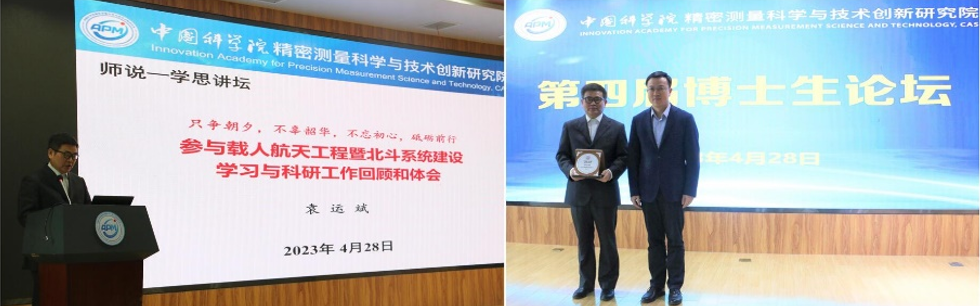 袁运斌做论坛特邀报告暨“师说·学思”讲坛《只争朝夕、不负韶华,不忘初心、砥砺前行》,从自己青少年阶段的成长经历和大学期间的往事谈起,结合自己的读研经历和实践经验,给同学们提出了三点建议:一是要在年轻的时候为未来长远的开展而努力专心地学习;二是要对自己的人生阶段、社会地位和工作岗位都要有合适的定位;三是要干可持续的、有意义的、可开展的事情。特邀报告结束后,洪成浩为袁运斌颁发“师说·学思”讲坛纪念牌。