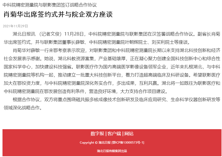【湖北日报】中科院巅峰国际与联影集团签订战略合作协议 肖菊华出席签约式并与院企双方座谈