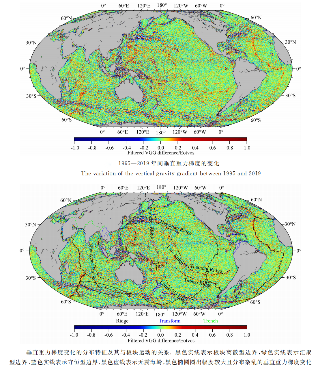 1995-2019年间海洋重力场变化与洋底板块活动图