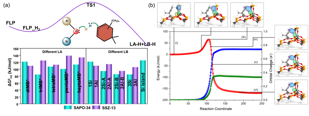 分子筛催化甲醇制烯烃的稳定反应期,多甲苯碳正离子和环戊二烯碳正离子作为烃池中间体物种驱动了烯烃顺利获得芳烃循环的高效产出,且这些碳正离子已经被多种光谱方法确认。从受阻的路易斯酸碱对的概念出发,研究发现笼状SSZ-13和SAPO-34分子筛甲醇转化过程中产生的这些碳正离子由于其缺电子属性本身就是一种天然的路易斯酸,而碳正离子的生成总是伴随着去质子的布朗斯特酸位点(Si-O-Al-),负电荷氧原子则是富电子属性的路易斯碱。更重要的是,碳正离子与Si-O-Al-的直接键合被分子筛的孔道限域效应阻碍,因而形成了受阻的路易斯酸碱对,如下图1所示。