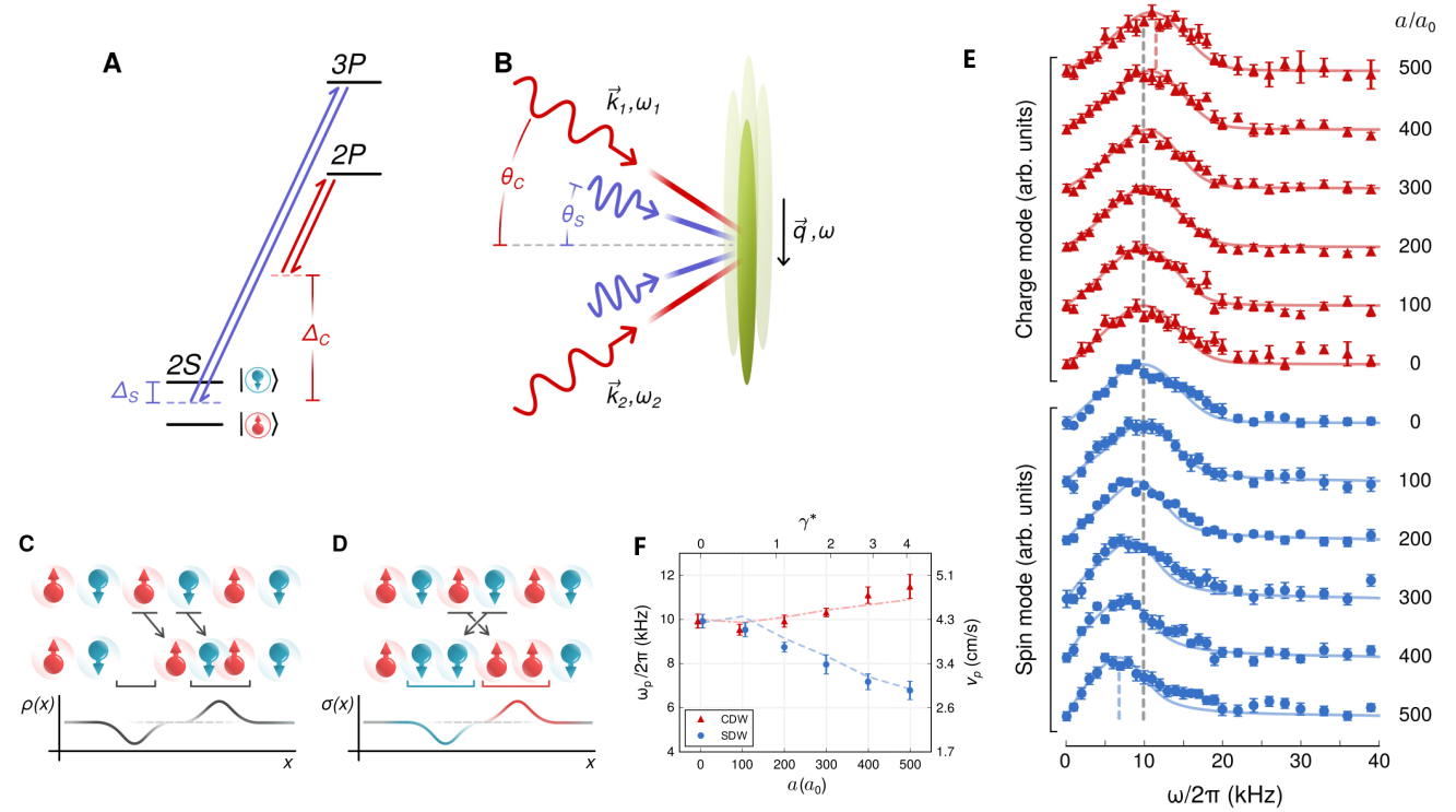 2020年至今,研究团队进一步合作顺利获得囚禁一维超冷原子实验成功地验证了这一重要的量子多体物理的普适规律。在囚禁的一维超冷6Li费米原子中,他们对电荷DSF的测量选择了精细能级|1> and |2> (|F = 1, MF = ±1/2)作为自旋态,2P3/2态为激发态,对自旋DSF的测量选择了精细能级|1> and |3> 作为自旋态,3P3/2态为激发态,参见图二(A-D)。他们顺利获得布拉格光分别激发电荷与自旋密度波,并调控不同相互作用强度测量出其相应的电荷和自旋的布拉格谱,参见图二(E)。在不同相互作用下布拉格谱的峰值给出了相应的电荷和自旋的传播声速,参见图二(F)。在理论方面,他们顺利获得复杂的三维粒子数分布取得了一维管状系统中的密度分布,再进一步利用一维相互作用费米气体杨-高丁模型精确解和朝永-拉亭戈液体理论精确计算了囚禁冷原子电荷与自旋的DSF。考虑了电荷激发谱中的曲率修正和自旋激发谱中的反向散射引起的非线性效应后,理论与实验结果非常吻合。这在国际上首次顺利获得超冷原子实验验证了自旋-电荷分离现象的朝永-拉亭戈液体理论,并给出非线性拉亭戈液体理论的有力证据。本项工作不但展现了量子多体物理中的典范,并且为将来基于原子分子和光物理的精密测量科技给予了新的思想。