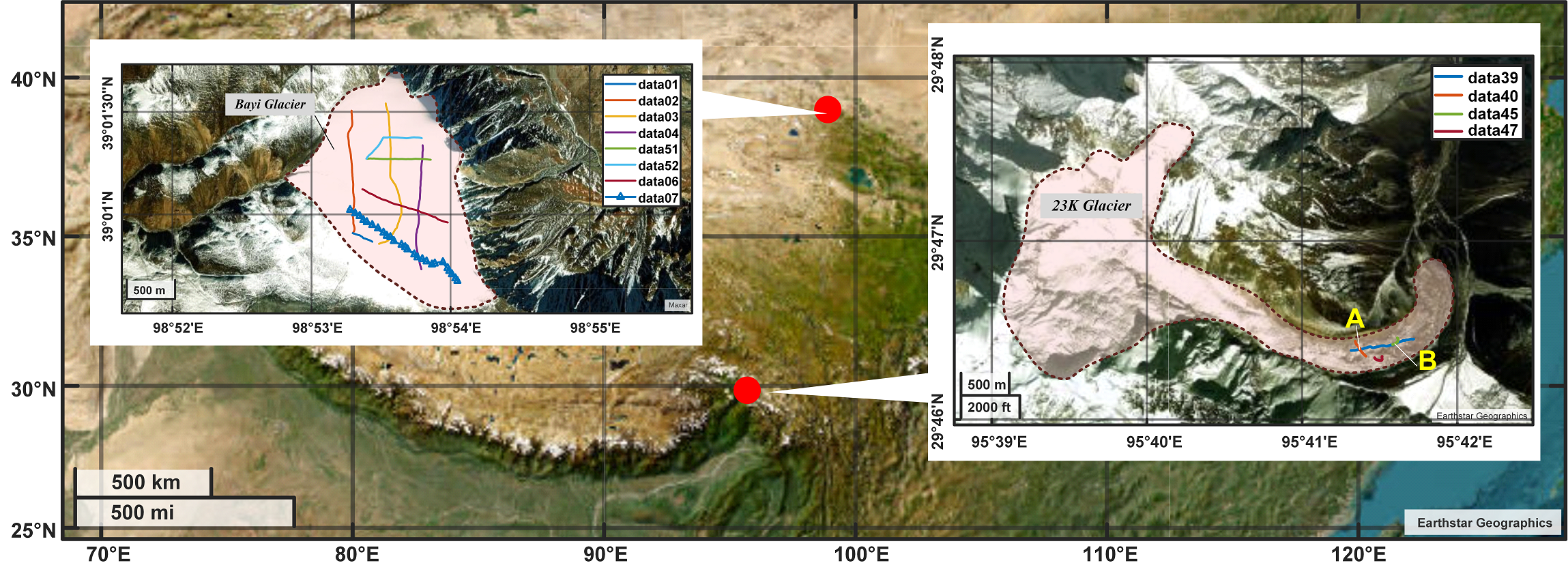 为此,研究团队分别于2023年3月和2023年9月在八一冰川、23k冰川野外考察中共采集了12条GPR冰厚测线数据,并基于该数据构建了富含水冰川场景下透视雷达波束畸变模型与冰岩界面探测模型,分析了冰川厚度测量误差传播特性,提出了粒子群-剔除平均-恒虚警检测(PSO-CTM-CFAR)联合的冰岩界面起伏特征提取技术,实现了低信噪比下冰下地形的精细化探测。